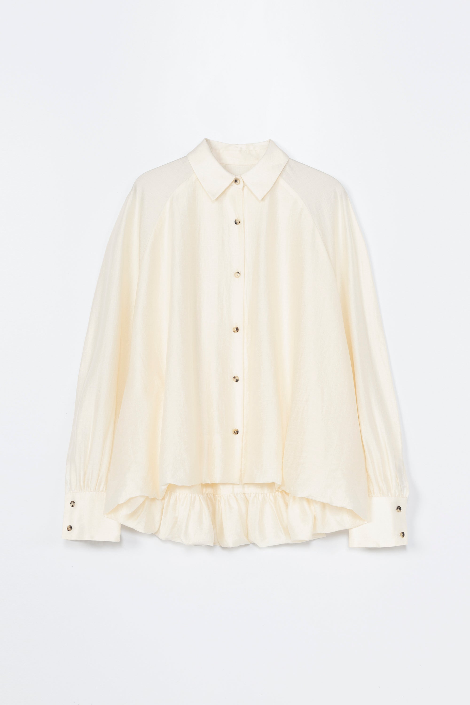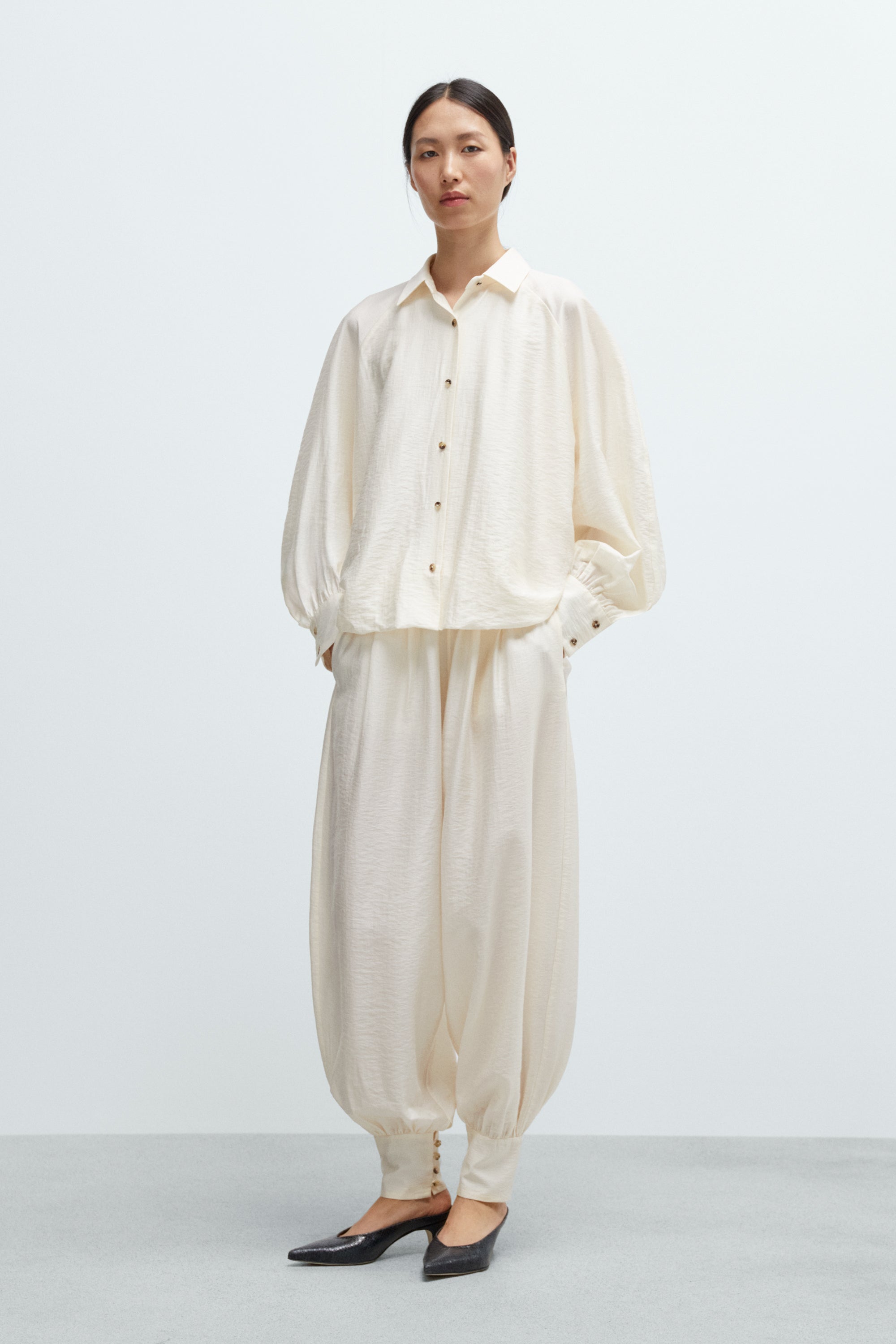 This oversized shirt is crafted from a fluid, subtly sheer fabric that drapes beautifully on the body. It features a balloon-style back with a longer hemline at the rear for added movement and volume. Designed with a classic pointy collar, front button closure, and voluminous sleeves gathered into wide cuffs with two small buttons. A standout piece on its own or worn as a set with the matching trousers.