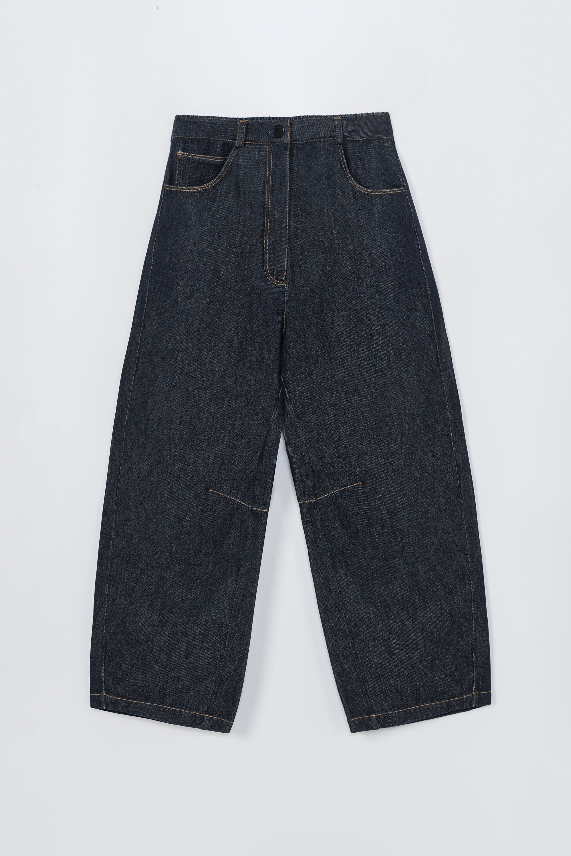 These curved baggy jeans feature a dark denim wash with contrasting stitching for a classic yet distinctive look. Designed with an oversized fit and low rise, they offer relaxed comfort and style. The traditional five-pocket design includes three front and two back pockets, complemented by belt loops for versatility. A unique internal knee seam adds subtle detail. Made from soft, substantial cotton fabric, these jeans provide ease of movement with a comfortable, non-rigid feel.