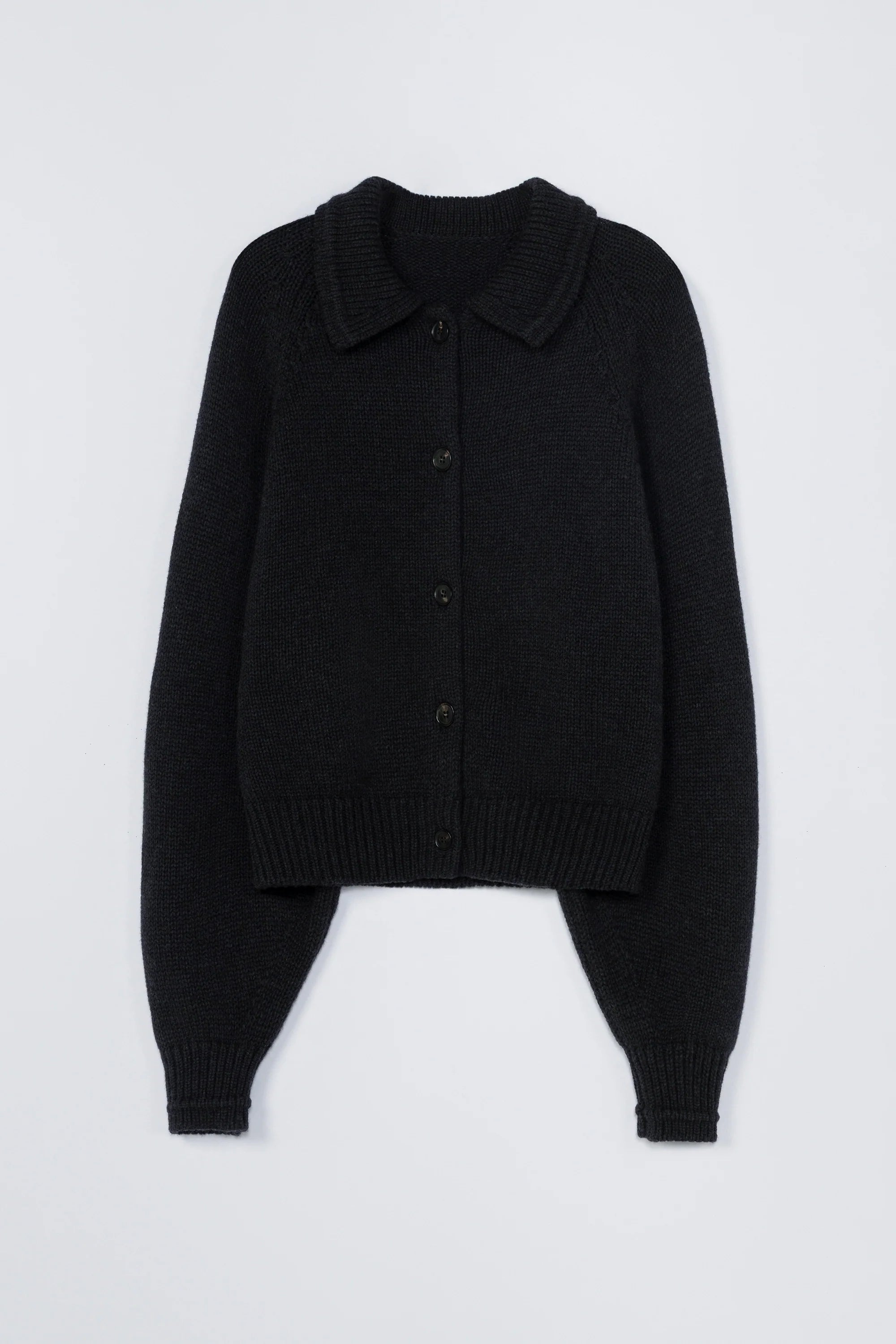 Boxy fit with horn front button closure and Italian collar. Ribbed detailing on cuffs, collar, and hem. Crafted from chunky knit for a warm and cozy feel, this easy-to-wear cardigan will be a staple in your winter wardrobe.