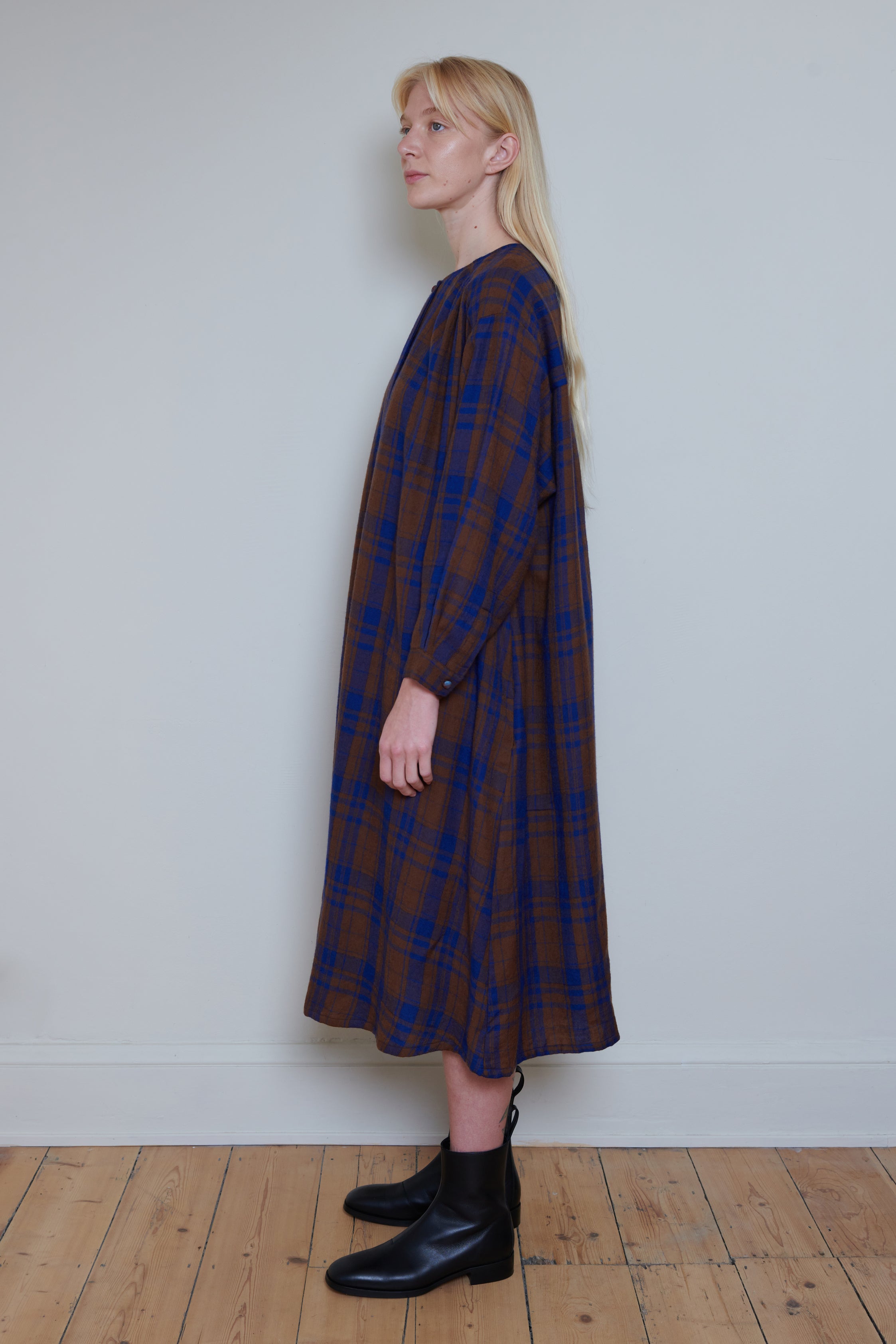 Handloom merino wool dress in a beautiful brown and blue check from artisanal Indian brand Runaway Bicycle.