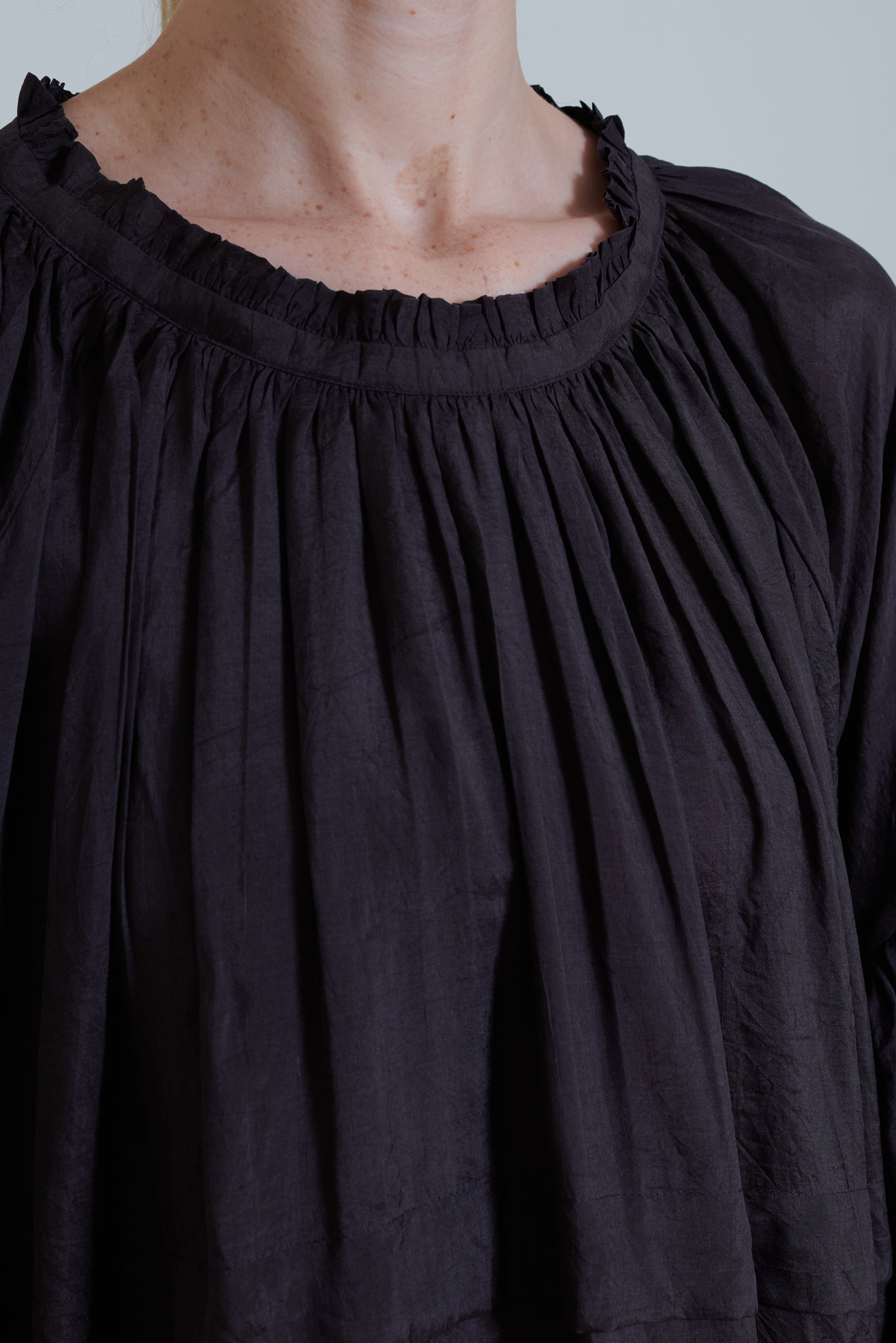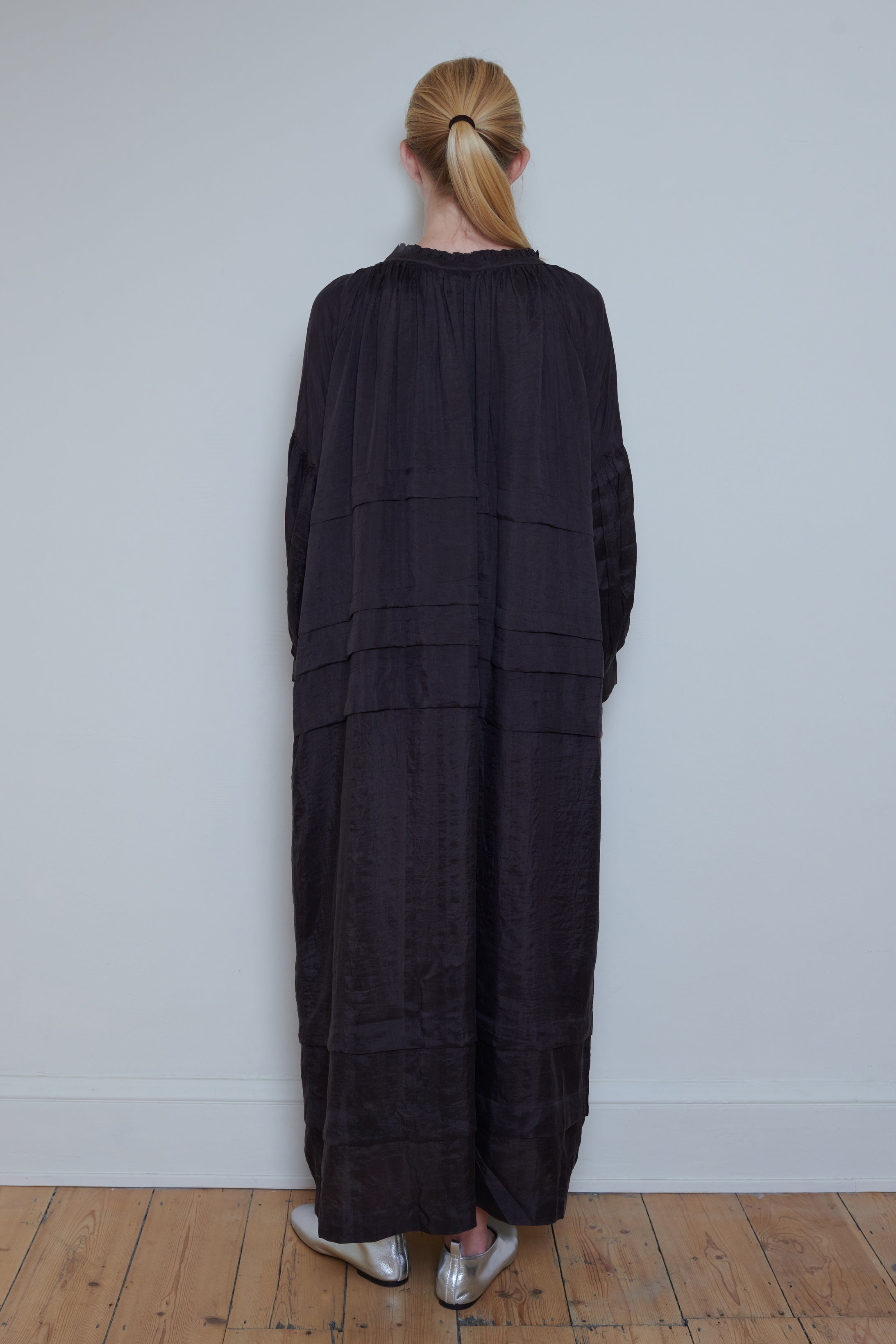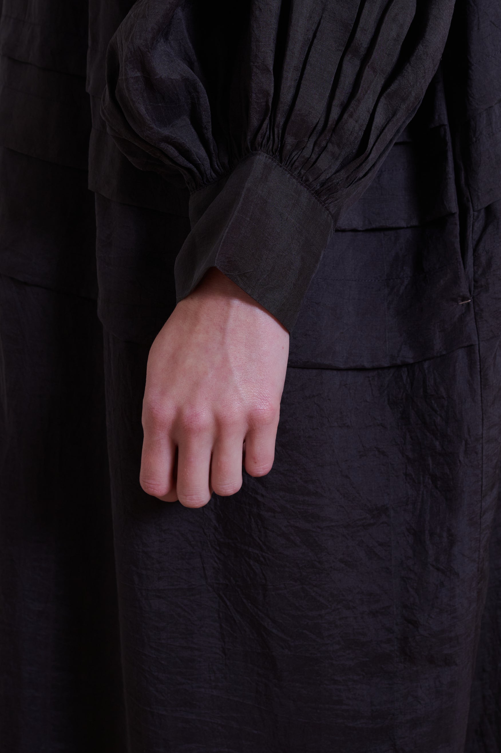 Handloom silk silk tiered dress, in a beautiful rich brown colour from artisanal Indian brand Runaway Bicycle. Pleating around neck and sleeves.