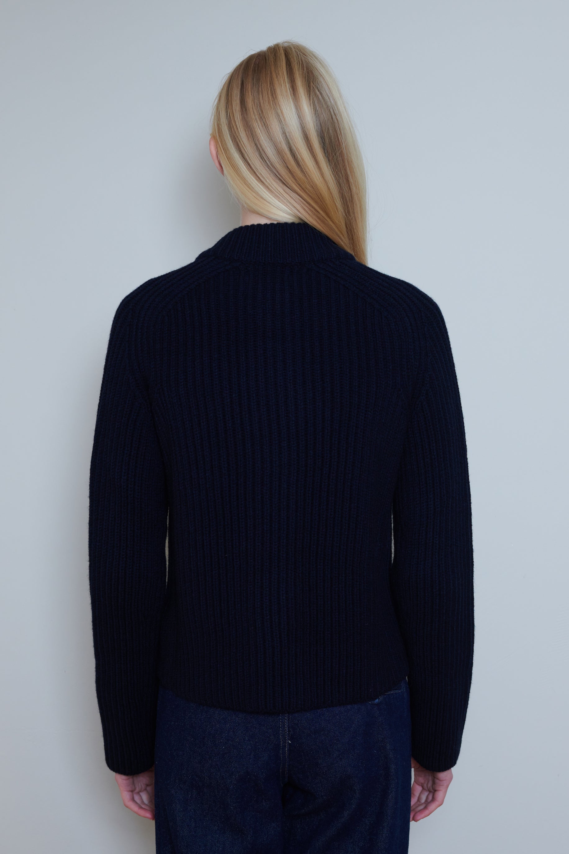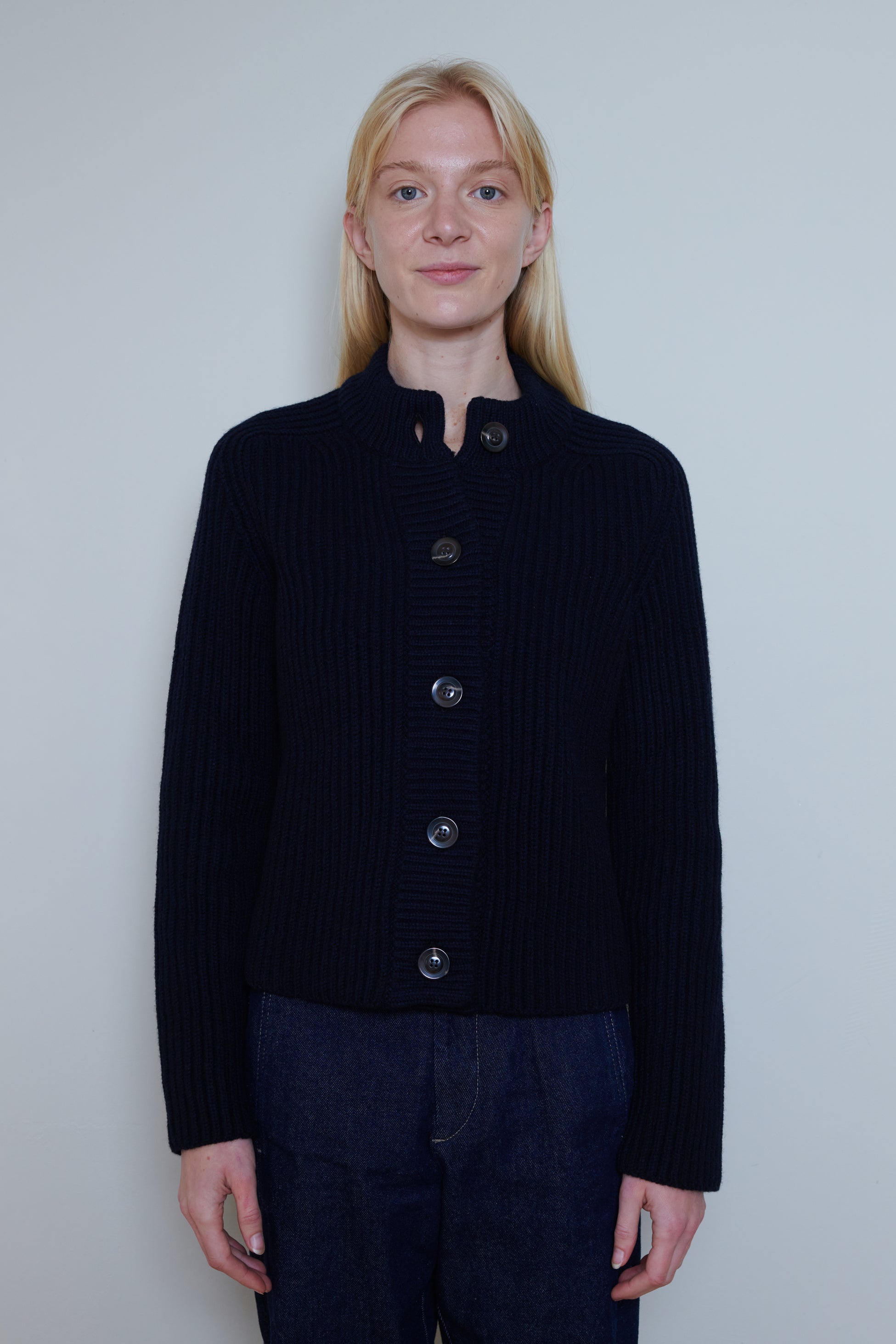 Ribbed Merino wool cardigan from Parisian brand Souer. Short, loose fit with round neckline and button front.
